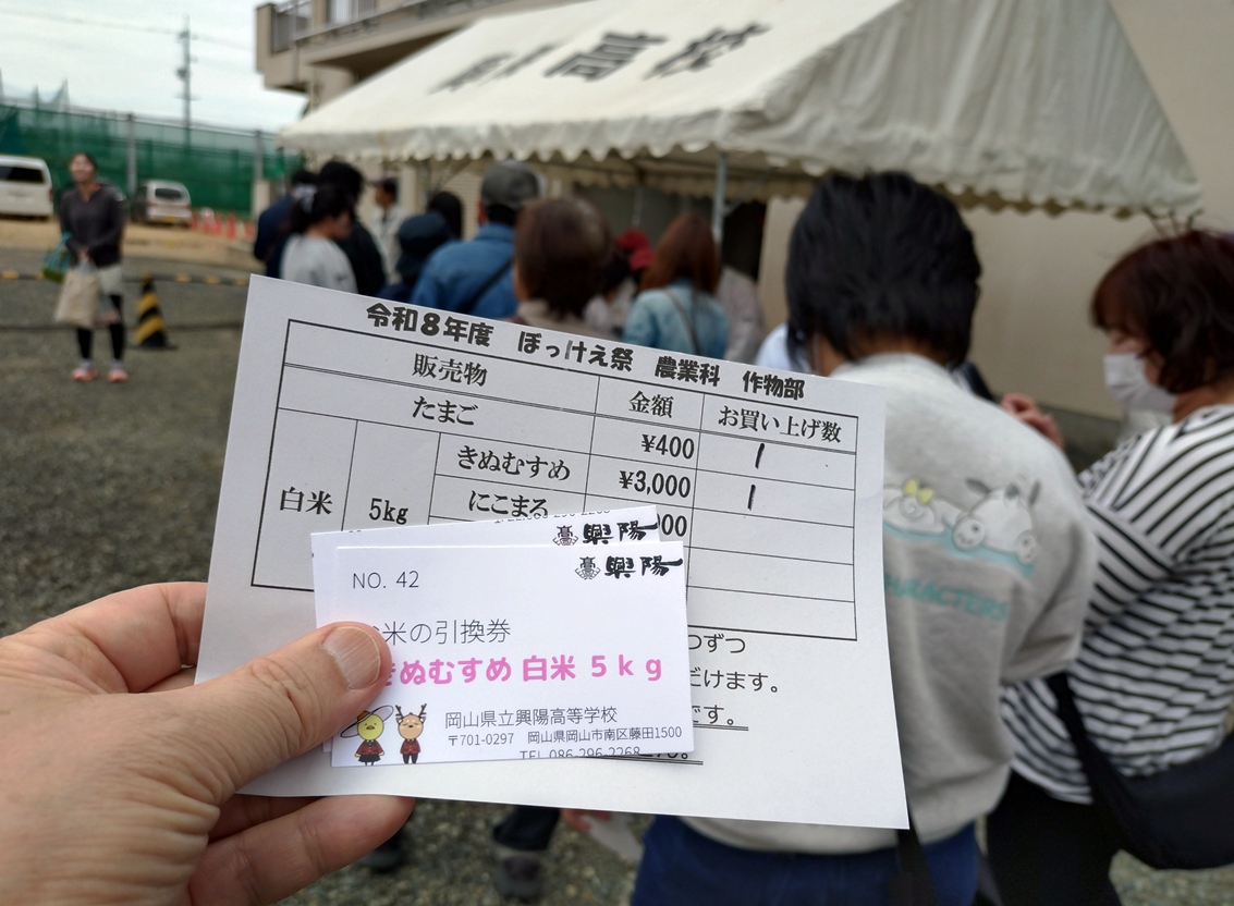 4月18日岡山県立興陽高校『ぼっけぇ祭』 9時からの販売なのに8時半からお米を買い求めて並びました。 同じ思いの方々で、既に長蛇の列でしたが、 有精卵とともに購入できました。 この日のための準備や生徒さんの元気な声、 実業高校ってホントいいな~って思いました。 コーヒーやぜんざいも美味しくいただき、 花苗も造園デザイン科の生徒さんが色々アドバイスしてくれたので 30ポットも買いました。。 実業高校って、ホントいいな~って感じました。