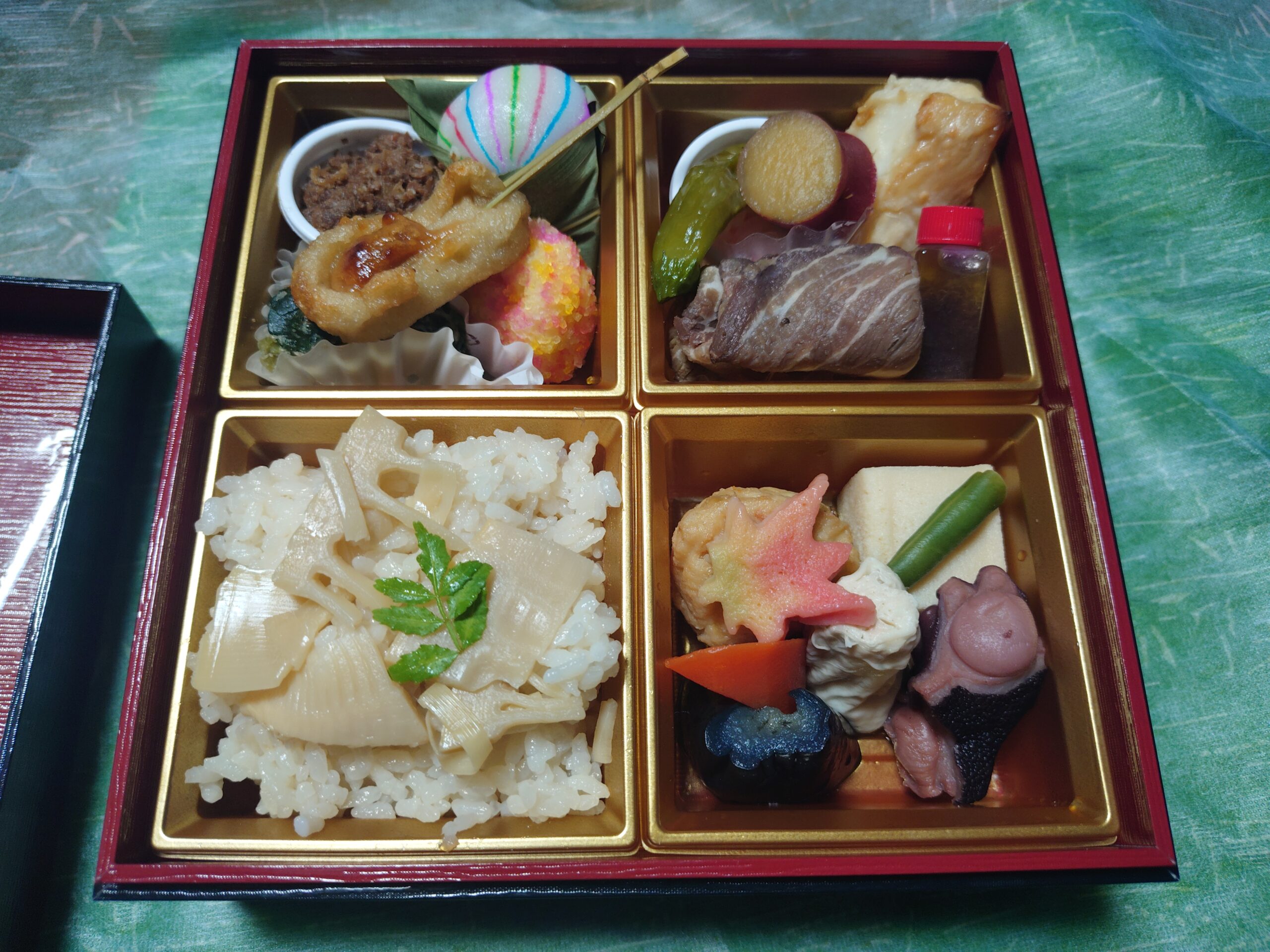今日、4月3日。 会社から毎年恒例のお花見弁当をいただきました。 普段、一人暮らしでまともなモノを食べてないので本当に美味しかったです。 本来ならお花見をしながら食べたほうが良いのですが、仕事で毎日のようにお花見出来ているのでお部屋でいただきました。